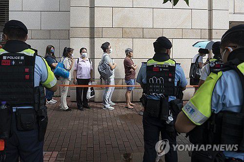 (EPA=연합뉴스) 지난달 25일 국가보안법 재판이 열리는 홍콩 법원에 입장하기 위해 줄을 선 방청객들을 경찰이 통제하고 있다. 2024.7.11. |