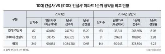 11일 부동산시장 분석업체 부동산인포가 한국부동산원 청약홈 아파트 경쟁률을 분석한 결과에 따르면 올해 상반기 삼성물산, 현대, 대우건설 등 시공능력평가 순위 상위 10대 건설사가 분양한 아파트의 1순위 평균 경쟁률은 8.07대 1로 집계됐다. 순위 외 건설사 아파트 경쟁률(3.98대 1)보다 2배 이상 높은 수치다.