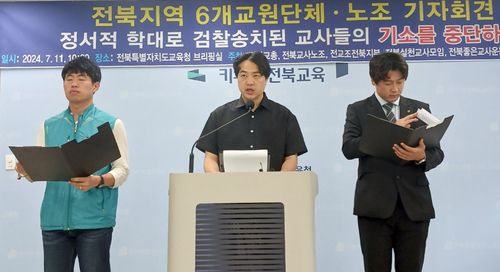 전국교직원노동조합 전북지부와 전북교사노조, 전북교총 등 6개 단체는 이날 전북특별자치도교육청에서 기자회견을 열고 "학생들에게 사과를 권유했을 뿐인데 경찰은 피해자 진술만을 바탕으로 정서적 학대라며 사건을 송치했다"면서 이같이 밝혔다.
