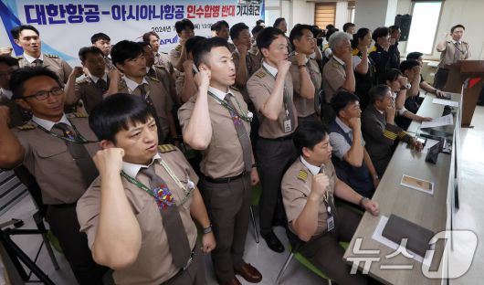 (서울=뉴스1) 이동해 기자 = 아시아나 항공조종사노동조합과 항공노동조합원들이 11일 오후 서울 중구 민주노총에서 열린 대한항공-아시아나항공 인수합병 반대 기자회견에서 구호를 외치고 있다. 2024.7.11/뉴스1eastsea@news1.krCopyright ⓒ 뉴스1. All rights reserved. 무단 전재 및 재배포, AI학습 이용 금지.