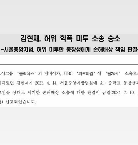 지난 10일 김현재는 자신의 SNS를 통해 승소 사실을 알렸다. 그가 공개한 사진에는 “김현재가 지난 4월 14일 서울지방법원에 제기한 손해배상 소송에 대한 판결이 금일 선고되었다”는 판결문이 담겨 있다. 이로써 김현재는 JTBC ‘피크타임’ 하차 1년 만에 학교 폭력 논란을 완전히 종결하게 되었다.