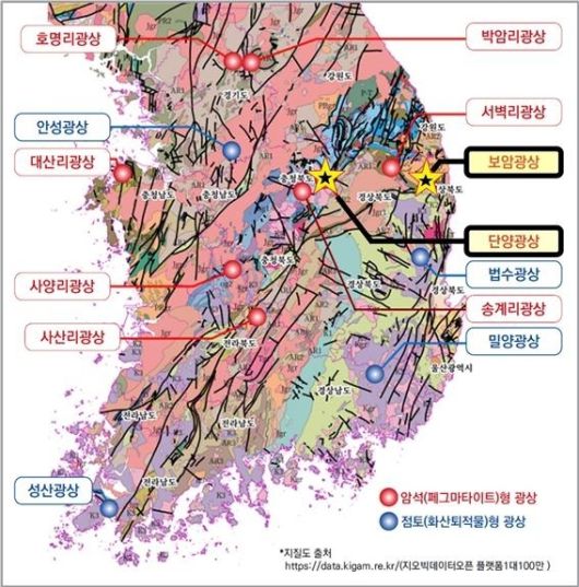 국내 리튬 광상 분포도. 한국지질자원연구원 제공 |