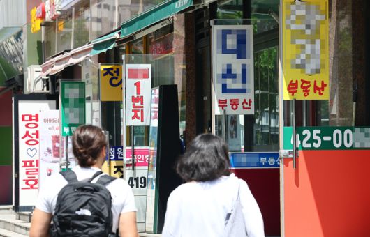 지난 10일 서울 시내의 부동산 사무실 앞으로 시민들이 지나가고 있다. 뉴시스 |