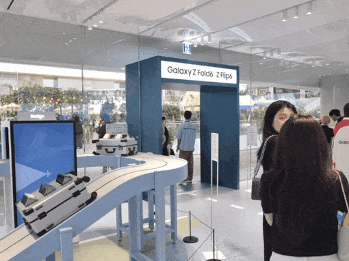 한 외국 공항처럼 꾸며진 갤럭시 익스피리언스 스페이스는 체크인부터 비행기 탑승, 비행까지의 여정을 갤럭시 Z폴드·플립6와 함께한다는 컨셉으로 구성됐다. 수화물 컨베이어 벨트에서 갤럭시 Z폴드·플립6가 실려왔다.