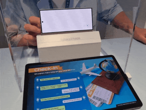 체크인 존에서는 갤럭시 Z폴드6의 실시간 통역 기능을 이용해 외국인 직원과 자유롭게 소통하며 보딩패스를 발급받을 수 있었다. 여기서는 갤럭시 Z폴드·플립6의 커버화면을 이용해 편하게 통역 기능을 이용할 수 있었다.