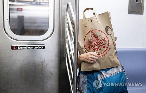 식료품 상점 봉투 안고 있는 뉴욕 지하철 승객 |