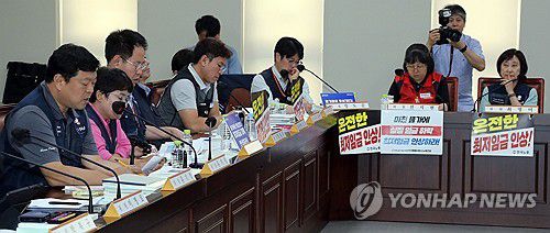 (세종=연합뉴스) 고미혜 기자 = 내년 최저임금 결정을 위해 마라톤 논의를 이어가고 있는 노동계와 경영계가 최저임금 수정 요구안으로 각각 시간당 1만840원, 9천940원을 내놓았다.