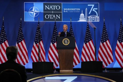 조 바이든 미국 대통령이 11일(현지시간) 북대서양조약기구(NATO·나토) 정상회의를 마친 이후 기자회견에서 대선 레이스 지속 여부 등에 관한 기자들의 질문에 답하고 있다. 로이터연합뉴스 |