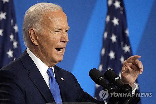 (서울=연합뉴스) 권수현 기자 = 조 바이든 미국 대통령이 북대서양조약기구(NATO·나토) 정상회의 마지막 날인 11일(현지시간) 단독 기자회견에서 카멀라 해리스 부통령을 대선 상대 후보인 도널드 트럼프 전 대통령으로 잘못 부르는 실수를 했다.
