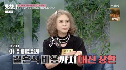 또 안미애는 시동생 결혼까지 뒷바라지를 했다고 밝히며 "마침 저희 집이 종로라서 거금을 받고 팔렸다. 마침 시동생이 결혼한다고 하더라고요. 그런데 예전부터 이상하게 (한기범이) 장남 노릇을 했다. 대소사도 저희가 다 치르고, 그래서 늘 고부갈등이 있을 수밖에 없었다"고 얘기했다.
