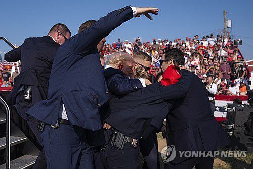 트럼프를 보호하며 무대 아래로 내려보내는 경호원들 |