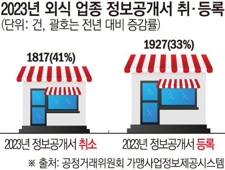 14일 공정거래위원회 가맹사업정보제공시스템에 따르면 지난해 외식업종 가맹본부 수는 6886개로 전년 6475개보다 6.3%(411개) 늘었다. 가맹본부 수는 늘었지만 최근 추이를 보면 증가 폭은 둔화세다. 2022년 가맹본부 수가 전년 대비 6.9%(420개) 늘어난 6475개였고, 2021년에도 전년 대비 38.7%(1689개) 증가한 6055개를 기록했다. 가맹본부가 가맹사업을 하기 위해 공정위에 필수적으로 등록하는 ‘정보공개서 등록’ 취소 건수도 늘고 있다.