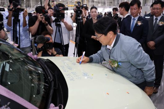 '캐스퍼 일렉트릭' 1호차 생산기념식이 열린 15일 광주 광산구 덕림동 광주글로벌모터스에서 강기정 광주시장이 기념 서명을 남기고 있다. 연합뉴스 |