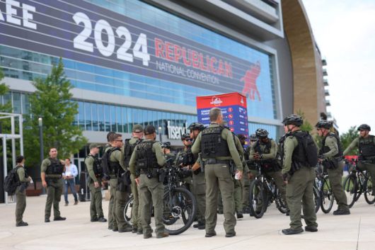 15~18일(현지시간) 미국 공화당 전당대회가 열리는 위스콘신주 밀워키의 파이서브 포럼 경기장 밖에 치안요원들이 집결해 있다. 지난 13일 발생한 도널드 트럼프 전 대통령에 대한 암살 시도로 경비가 한층 강화됐다. 트럼프는 이번 전당대회에서 오는 11월 대선에 나설 공화당 후보로 공식 지명받을 예정이다. AFP연합뉴스 |