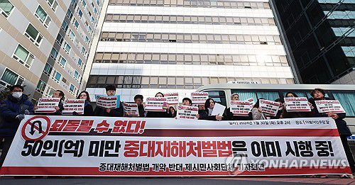 민주노총은 "중대재해처벌법 제정과 50인 미만 사업장 확대 적용은 전근대적이고 반복적인 죽음을 막기 위한 최소한의 출발점"이라며 "헌법 취지대로 차별 없이 노동자 시민의 생명과 안전이 지켜져야 한다"고 주장했다.