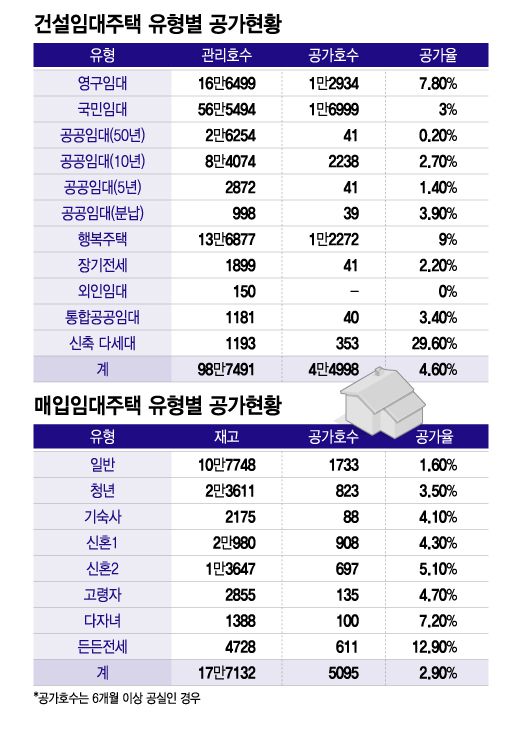 유형별로 살펴보면 신축 다세대가 공가율이 가장 높았다. 전체의 29.6%(1193호 중 353호)가 미임대 상태인 것으로 나타났다. 이후로 행복주택 9%(13만6877호 중 1만2272호), 영구임대 7.8%(16만6499호 중 1만2934호), 분납 공공임대 3.9%(998호 중 39호), 통합공공임대 3.4%(1181호 중 40호), 국민임대 3%(56만5494호 중 1만6999호), 10년 공공임대 2.7%(8만4074호 중 2238호) 등 순이었다.