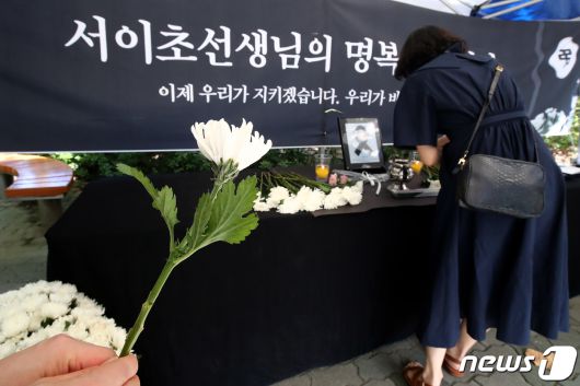 학부모 민원과 갑질에 시달리다 학교에서 극단적 선택을 해 세상을 떠난 서울 서이초등학교 교사 사망 사건이 일어난 지 1년이 흘렀지만, 현장 교사들이 교권 보호 제도가 개선됐다고 느끼는 비율은 현저히 낮다는 조사 결과가 16일 나왔다. 사진은 지난해 9월 4일 대구교육청 앞 분수광장에 마련된 서울 서이초 교사 49재 추모 분향소를 찾은 동료 교사들이 헌화하고 모습. 2023.9.4/뉴스1 ⓒ News1 자료 사진 |