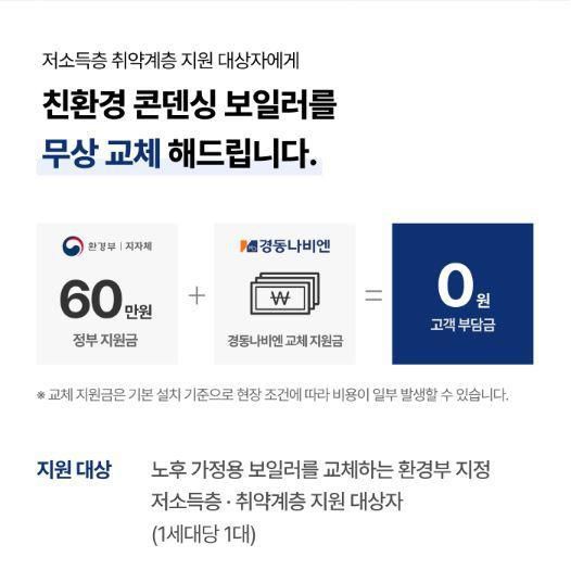 보일러업계에 따르면 가정용 콘덴싱 보일러 구매와 설치비용은 약 105만원이다. 정부 지원금을 받아도 본인 부담금이 45만원 가량 든다. 이에 경동나비엔은 저소득 가구의 원활한 콘덴싱 보일러 교체를 위해 정부 지원금 60만원을 제외한 차액을 지원하고 있다. 저소득 가구가 경동나비엔 콘덴싱 보일러로 교체 시, 비용이 한 푼도 들지 않는 셈이다.