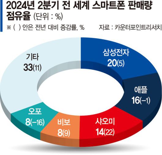올해 2·4분기 전 세계 스마트폰 출하량은 3억대 안팎으로 추정된다. 해당 분기 기업별 출하량 점유율은 △삼성전자 18% △애플 16% △샤오미 15% 순이다. 이 중 삼성전자는 5400만대를 출하하면서 점유율 1위를 유지했다. 판매량은 지난해 4·4분기부터 1위를 지속하고 있으며, 올해 2·4분기 판매량은 전년 동기 대비 5% 성장했다.