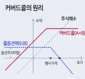 커버드콜은 바로 이 콜옵션 매도를 활용한 투자 전략이다. 콜옵션을 활용, 본인이 생각하는 목표수익 대비 미달분을 ‘커버’한다고 생각하면 된다. 주식 등 기초자산 가격이 횡보할 때 콜옵션 매도로 생기는 꾸준한 프리미엄(옵션가격)으로 현금흐름을 창출할 수 있지만, 주가 상승에 따른 시세 차익은 얻을 수 없다. 반대로 주가가 떨어질 때는 하락한 만큼 손실을 보는 구조다.