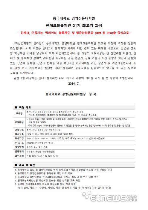 동국대학교가 21기 핀테크블록체인융합산업 최고고위자 과정을 개강한다. |