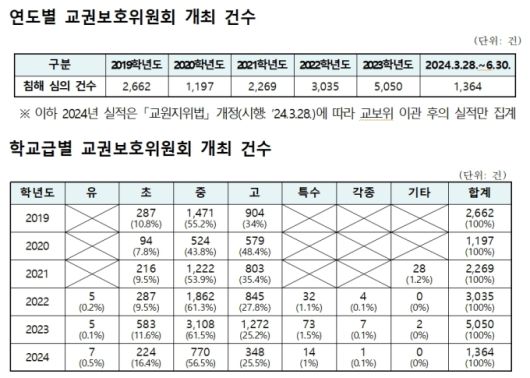 교육부 관계자는 "(교보위 개최수 증가는) 과거보다 학부모에 의한 교육활동 침해에 대해 선생님들이 민감해졌기 때문"이라며 "보호자에 관한 (교육활동 침해) 조치가 대폭 강화된 영향도 있다"고 설명했다.