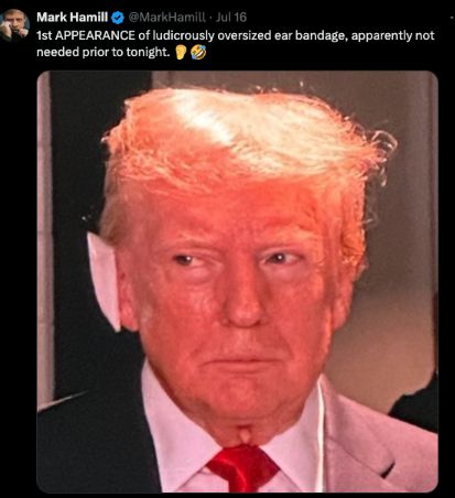 지난 16일 마크 해밀은 자신의 X(엑스, 구 트위터) 계정에 오른쪽 귀에 붕대를 감은 트럼프 전 대통령의 사진 한 장을 올리며 "터무니없이 큰 귀 붕대가 등장했다. 분명 오늘 밤 전까지는 필요하지 않았을 거다"라고 글을 남겼다. 귀와 웃는 모양의 이모지(감정·사물을 이미지로 나타낸 것)도 붙였다.