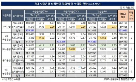 5대 은행 중 운용 수익률을 보면 차이가 있었다. 원리금 비보장 기준 확정기여형(DC) 수익률은 하나은행이 14.83%로 가장 높았고 KB국민은행은 13.73%, 우리은행은 13.04%, 신한은행은 12.81%, NH농협은행은 11.80% 순이다.