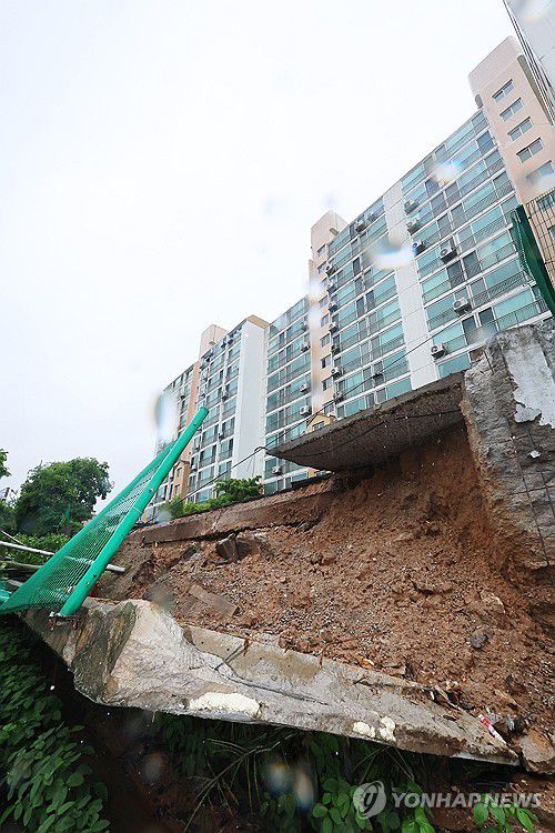 (인천=연합뉴스) 임순석 기자 = 18일 집중호우로 인천 강화군 갑곳리의 한 아파트 옹벽이 무너져 있다. 2024.7.18 soonseok02@yna.co.kr ▶제보는 카카오톡 okjebo▶연합뉴스 앱 지금 바로 다운받기~▶네이버 연합뉴스 채널 구독하기 <저작권자(c) 연합뉴스, 무단 전재-재배포, AI 학습 및 활용 금지><저작권자(c)연합뉴스. 무단전재-재배포금지.>