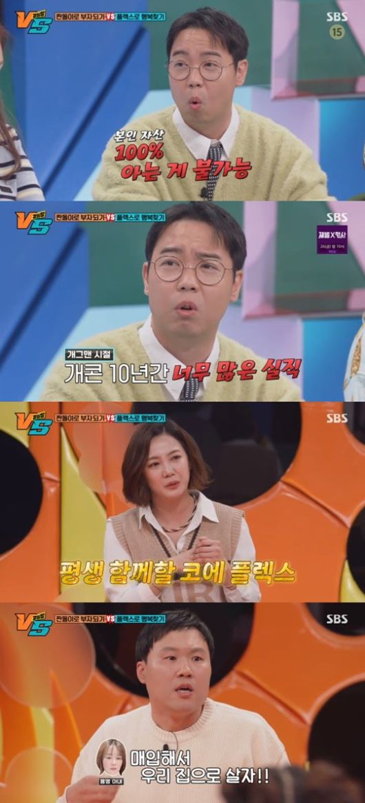 황현희는 "예전에는 외제차 탔고, 제일 좋은 동네에 월세나 전세로 살았다. 지금 생각하면 그때 시드머니를 더 늘렸더라면 지금의 10배가 될 수도 있었을텐데 그때 너무 플렉스했다"며 아쉬움을 고백했다. 이어 그는 "경제적 자유가 내 목표다. 내 시간을 방송국에 안 줘도 되는 것. 싫어하는 일을 하지 않는 것이 경제적 자유"라고 의견을 밝혔다.
