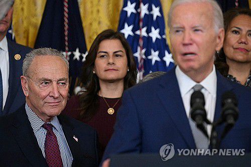 조 바이든 대통령의 연설을 지켜보는 척 슈머 민주당 상원 원내대표(좌측) |