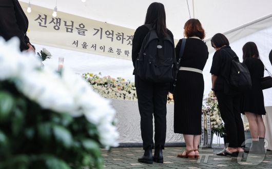 서이초 교사 사망 1주기인 18일 서울 서초구 서이초등학교에 마련된 추모장소에서 추모객들이 추모를 하고 있다. 2024.7.18/뉴스1 ⓒ News1 김도우 기자 |