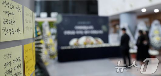 (전주=뉴스1) 유경석 기자 = 18일 전북 전주시 전북특별자치도교육청에서 열린 故 서이초 순직교사 1주기 추모제에서 참석자들이 청내에 마련된 추모공간에서 헌화를 하고 있다. 2024.7.18/뉴스1Yks919@news1.krCopyright ⓒ 뉴스1. All rights reserved. 무단 전재 및 재배포, AI학습 이용 금지.