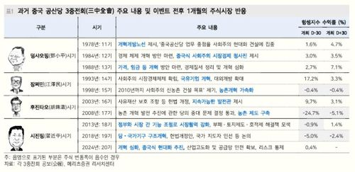 그러면서 "시진핑 주석의 집권 시기 3중전회가 개최된 후 1개월 주가 변동폭은 모두 적었다"며 "올해에도 비슷한 흐름이 예상된다"고 짚었다.