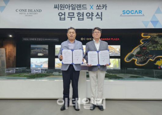김신명(오른쪽) 쏘카 카셰어링그룹장과 주호진 라마다프라자호텔&씨원리조트이 18일 광주 북구 지오그룹 본사에서 업무협약식을 마치고 기념촬영하고 있다.(사진=쏘카) |