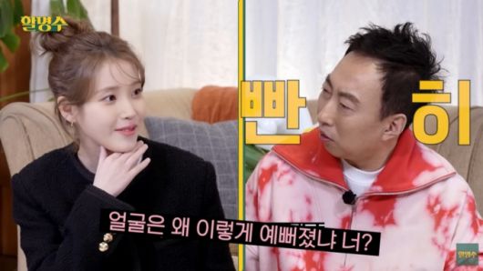 개그맨 박명수(오른쪽)와 가수 겸 배우 아이유. /사진=유튜브 채널 '할명수' 캡처 |