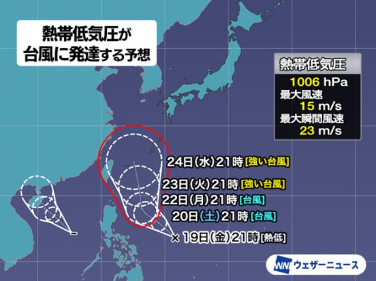 6호 열대저압부는 19일 밤 9시 필리핀 마닐라 동쪽바다에서 생성돼 24시간 이내에 태풍으로 발달될 것으로 예상된다. 4호 태풍 프라피룬이 될수도 있다.