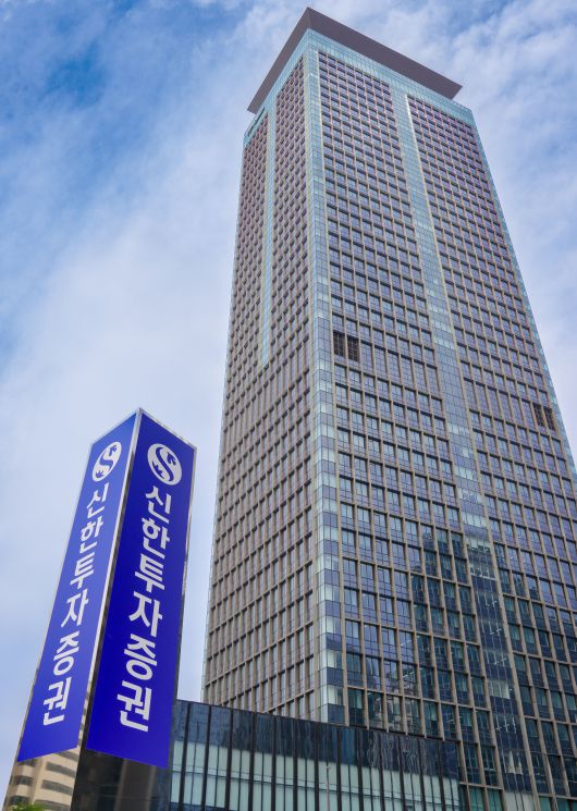 서울 영등포구 여의도 TP타워. 신한투자증권은 6월 말부터 8월 초까지 6주간 본사 사옥을 이전하고 있다. 이 사진은 임시로 세로 간판을 세운 뒤 촬영했다. /신한투자증권 제공 |