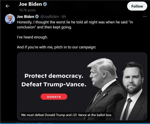 특히 바이든 대통령은 트럼프 전 대통령이 연설 중 "외국 독재자들과 잘 지냈다"고 자랑하는 대목을 동영상으로 첨부하면서 "그 이유는 트럼프 본인이 독재자가 되길 바라고 있기 때문"이라고 공격했다.