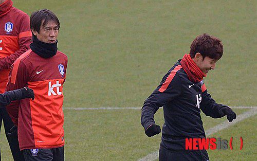 【파주=뉴시스】김인철 기자 = 축구 국가대표팀 홍명보 감독이 14일 오후 경기 파주NFC(축구국가대표팀트레이닝센터)에서 스위스와 평가전을 하루 앞두고 훈련 중인 손흥민과 이야기를 나누고 있다. 2013.11.14. yatoya@newsis.com |