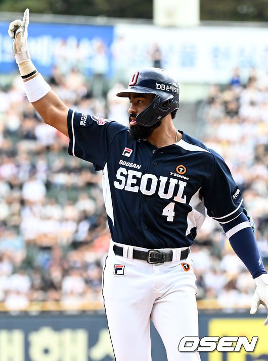 [OSEN=잠실, 민경훈 기자] 21일 서울 송파구 잠실야구장에서 ‘2024 신한 SOL Bank KBO리그’ LG트윈스와 두산 베어스의 경기가 열렸다. LG는 손주영을, 두산은 최원준을 선발로 내세웠다. 3회초 2사 주자 1루 두산 라모스가 우익수 앞 안타를 때린 후 1루에서 세리머니를 하고 있다. 2024.07.21 /rumi@osen.co.kr