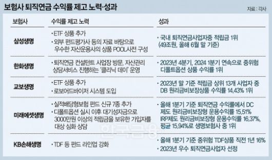 한화생명은 디폴트옵션상품 선정위원회 운영 등으로 노력한 결과 2023년 4분기, 2024년 1분기 연속으로 중위험 디폴트옵션 상품 수익률 1위를 달성했다. 미래에셋생명은 올해 1분기 기준 퇴직연금 수익률에서 DC제도 원리금비보장형 운용수익률 15.51%, IRP제도 원리금비보장형 운용수익률 16.37%, 평균 15.94%로 생명보험사 중 1위를 달성했다.