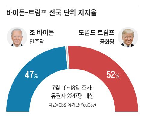 18일 미 CBS·유거브(YouGov)가 발표한 여론조사에 따르면 전국 기준 트럼프 지지율은 52%, 바이든은 47%였다. 지난 3일 여론조사 때 트럼프 전 대통령이 오차범위 내인 2%포인트 앞섰는데 더 격차가 벌어졌다. 이 조사는 지난 16~18일까지 유권자 2247명을 대상으로 실시됐다. 지난 주말 트럼프 암살 미수 사건이 벌어지고 나서 나온 결과다. 지지율 격차 확대는 지난달 첫 대선 TV토론에서 바이든이 참패한 데 이어 트럼프의 총격 사건으로 공화당 지지자들이 더 결집한 데 따른 것으로 분석된다. 이번 대선 결과를 좌우할 7개 경합주(애리조나·조지아·미시간·노스캐롤라이나·네바다·펜실베이니아·위스콘신)에서의 지지율 또한 트럼프가 3%포인트 앞섰다.