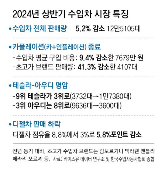 초고가 수입차 시장은 크게 위축되고 있다. 람보르기니, 맥라렌, 벤틀리, 페라리, 포르셰 등 슈퍼카·고급차 브랜드의 상반기 판매량(합계)은 전년 동기(6992대)보다 41.3% 떨어진 4107대를 나타냈다. 이 기간 8000만 원 이상 자동차 모델 중 가장 많이 팔린 5개 차량(벤츠 GLE, BMW X5, 벤츠 S클래스, BMW 6시리즈, BMW X7)의 판매량도 전년 동기보다 23.4% 줄었다. 8000만 원 이상의 고가 법인차에 연두색 번호판을 의무 부착하도록 하는 제도가 올해부터 시행된 것이 주요 배경으로 꼽힌다.