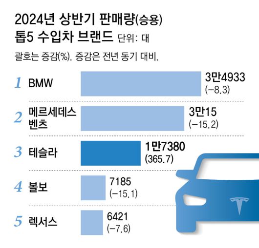 21일 자동차 시장조사 업체 카이즈유 데이터 연구소에 따르면 상반기(1∼6월) 수입차 시장에서 승용차 판매량이 1만 대 이상을 기록한 브랜드는 BMW(3만4933대), 메르세데스벤츠(3만15대), 테슬라(1만7380대) 등 세 곳이다. 이 중 순수 전기차 브랜드인 테슬라만 유일하게 전년 동기 대비 판매량이 늘었다. 전기차가 ‘캐즘’(일시적 수요 정체)에 빠졌다는 평가가 무색하게 테슬라 판매 증가율은 365.7%에 달했다.