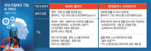대표적인 기업이 BHSN이다. BHSN은 자사 법률 AI ‘앨리비’를 필두로 아시아 기업 고객의 기업 간 거래(B2B) 솔루션을 제공한다는 방침이다. 앨리비는 계약·자문 등 법률 업무를 돕는 클라우드 기반 서비스형 소프트웨어(SaaS) AI다. 임정근 BHSN 대표는 19일 기자와의 통화에서 “글로벌 B2B 비즈니스를 타겟팅하고 있다”며 “법령, 정책 등의 데이터베이스(DB)를 학습한 리걸 AI를 기업이 활용하도록 지원할 것”이라고 말했다.