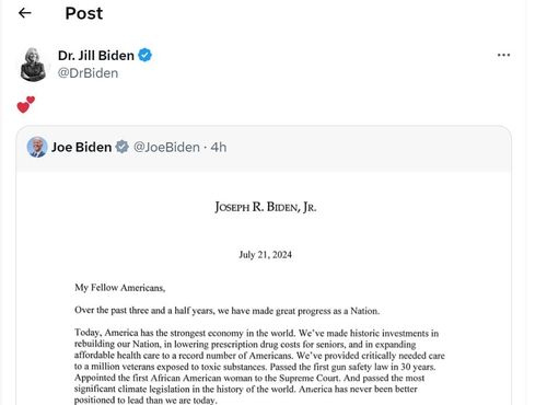 우선 바이든 대통령의 부인 질 바이든 여사는 이날 엑스(X·옛 트위터)에 바이든 대통령이 올린 사퇴 성명을 리트윗하고 진한 분홍색 하트 두개가 달린 이모티콘 을 달았다.