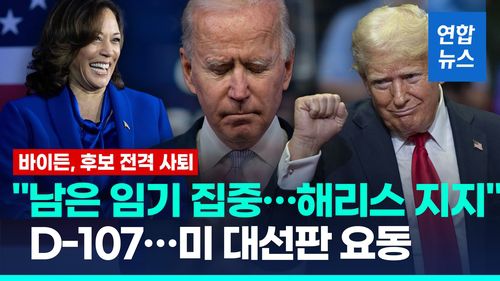(서울=연합뉴스) 오는 11월 미국 대선을 3개월여 앞두고 조 바이든 대통령(81)이 21일(현지시간) 민주당 대선 후보직에서 전격 사퇴하고 재선 도전을 공식 포기했습니다.