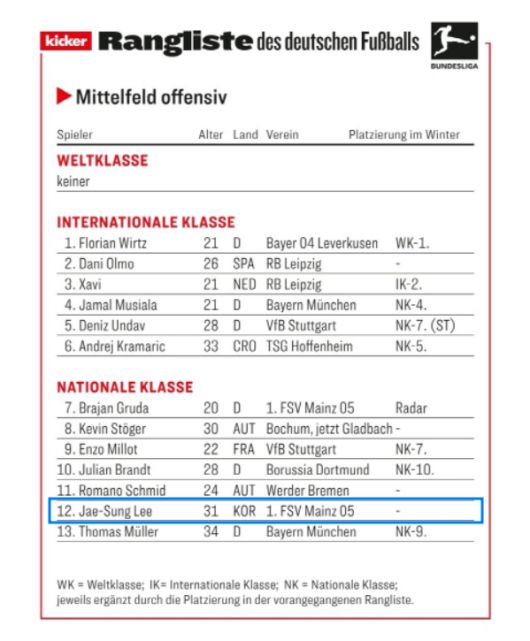 '키커'가 발표하는 랑리스테는 Weltklasse(월드클래스), Internationale Klasse(인터내셔널 클래스), 그리고 Nationale Klasse(내셔널 클래스) 부문으로 나눠진다. 이번에 발표된 후반기 랑리스테에서는 월드클래스가 없고 가장 높은 순위를 차지한 플로리안 비르츠(바이엘 레버쿠젠)가 인터내셔널 클래스의 최상단에 섰다.