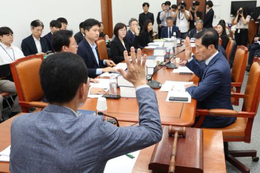 18일 오후 국회 환경노동위원회 안건조정소위원회에서 더불어민주당 소속 김주영 소위원장이 회의 공개 여부를 두고 표결을 진행하고 있다. 연합뉴스 |